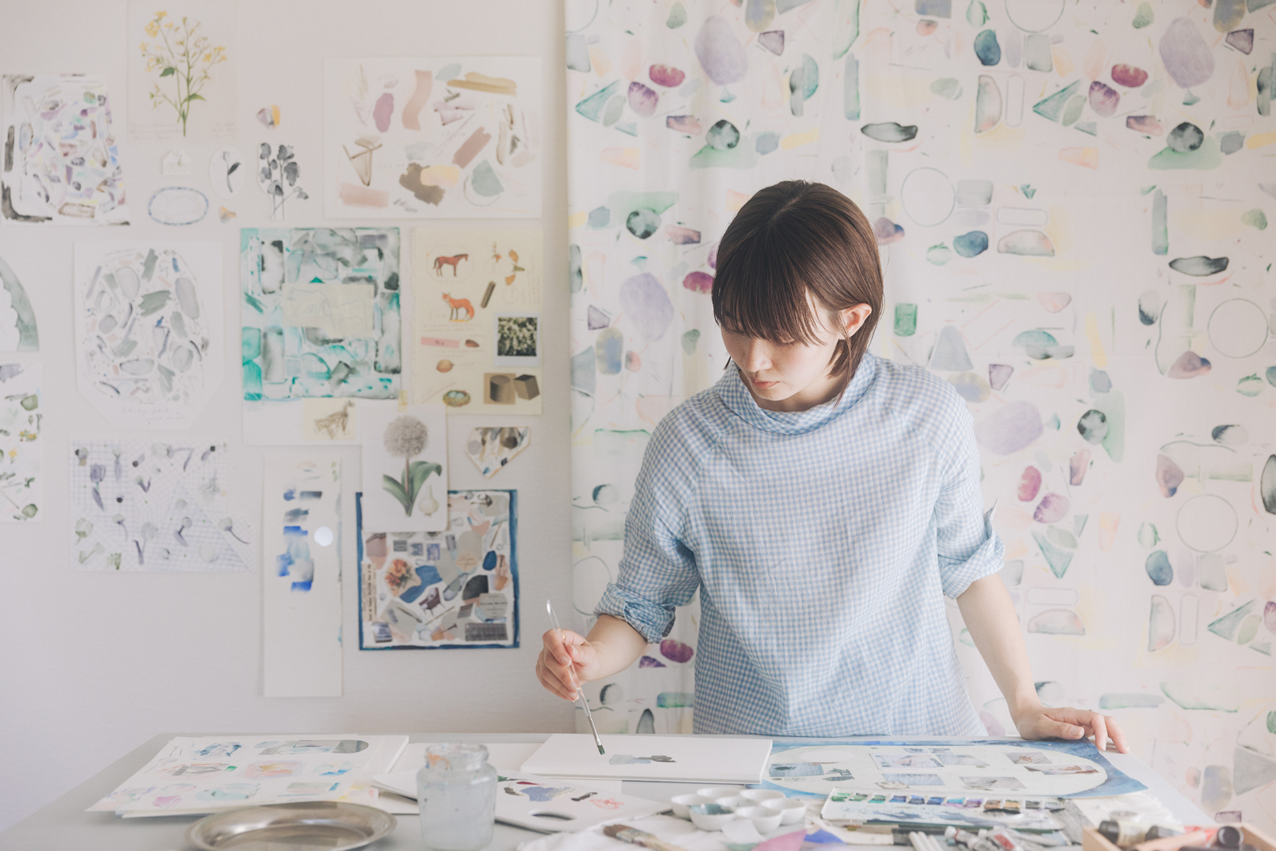扇子以外にもパッケージデザインから本の挿絵、ロゴデザインやテキスタイル製作など、ジャンルを超えてさまざまなデザインやアートワークを手がけている萌さん。